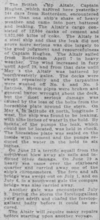 Op 27 april 1907 vertrekt het zeilschip Altair, onder gezag van kapitein John Hughes, bij zwaar weer uit Rotterdam. Aan boord bevindt zich een lading van 12.000 vaten cement en 1.522.000 kilo cokes. De Altair is een viermaster die in 1890 op de scheepswerf van W.H. Potter & Sons in Liverpool is gebouwd voor de rederij Boyes & Ruyter in Bremen. Het schip vertrekt echter onder Engelse vlag aangezien zij voor 27 april 1907 voor ongeveer $9000 is verkocht aan Lewis, Heron & Co. in Londen. Na vertrek uit Rotterdam neemt de wind steeds meer in kracht toe en van 29 april tot 4 mei wordt het schip regelmatig door zware stormen getroffen waarbij het ernstige averij oploopt. Stoomleidingen breken en bouten in de hoefijzerplaat bij de achtersteven raken verloren waardoor het schip water maakt. Door gebruik te maken van het cement aan boord worden de lekkages verholpen en met inzet van scheepspompen kunnen zij het niveau van het water dat in het ruim is gestroomd terugbrengen naar 15 centimeter. De Altair is een stalen schip en dat het lek niet ernstiger is geworden, is grotendeels te danken aan het gezonde verstand en de vindingrijkheid van kapitein Hughes. Op 29 juni komt de Altair wederom in zwaar weer terecht en daarbij raakt zij een van de chronometers kwijt. Nog maar net bekomen van deze tegenslag komt zij op 1 juli terecht in een zuidwesterstorm waarbij de kompasbrug verloren gaat. Na een reis van 144 dagen komt de Altair op 18 september 1907 met zware averij aan in SanFrancisco, California. The San Francisco Call, September 19, 1907
