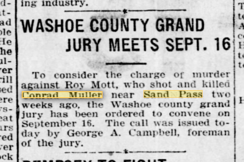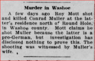 A few days ago Roy Mott shot and killed Conrad Muller, at the latter’s residence morth of Round Hole, Washoe County.