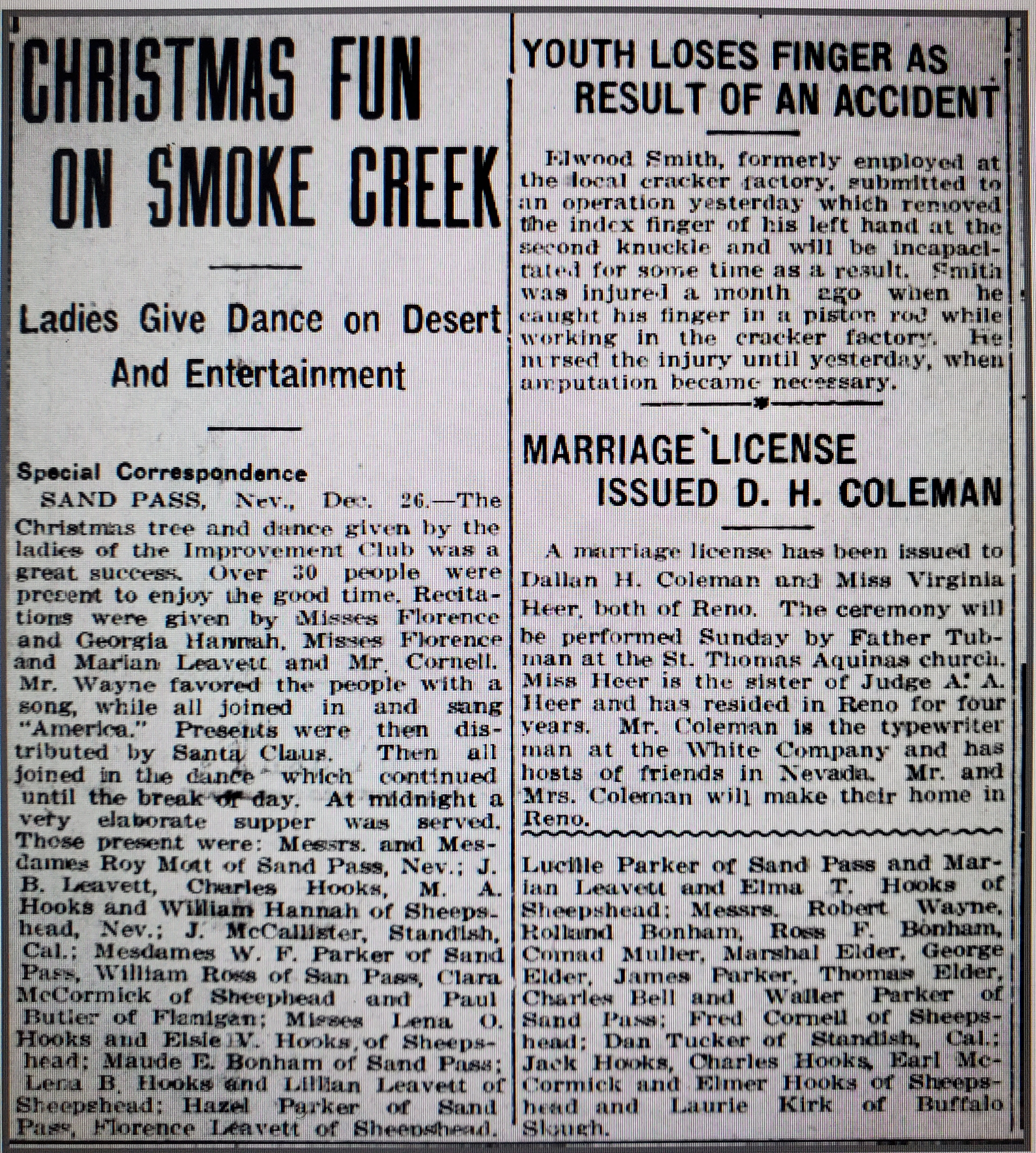 “Do you have any idea what his name was and about when he lived there? There is nothing there now except for some wrecked buildings and some railroad equipment. Meanwhile, I’m attaching an article from 1914 which lists some of the locals. If he owned land there it would be recorded somewhere in the Washoe Count Recorders office. Let me know the approximate date and name if you have one. Thanks!” Bob