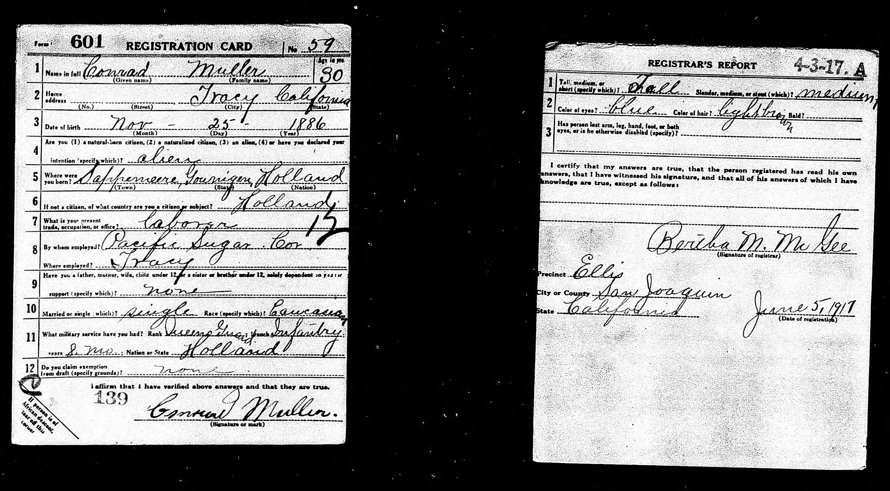Op een gegeven moment vond ik een registratiekaart WWI van hem d.d. 5 juni 1917 en we hebben natuurlijk de plaatsnamen van zijn brieven: Coalinga, Sand Pass en Sheepshead. Op een gegeven moment heb ik op facebook vragen gesteld over deze plaatsen, waar ze precies liggen e.d. en toen ging het snel. Neef Adam vond krantenartikelen waarin Conrad Müller werd genoemd. Die avond in februari 2020 doe ik de schokkende ontdekking dat hij op 17 augustus 1918 in koelen bloede is vermoord door een zekere Roy Mott en dat deze Roy Mott hiermee is weggekomen, dat hij voor deze moord niet is gestraft.